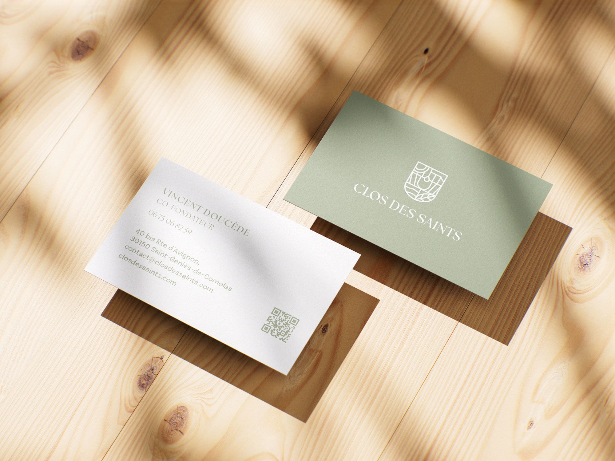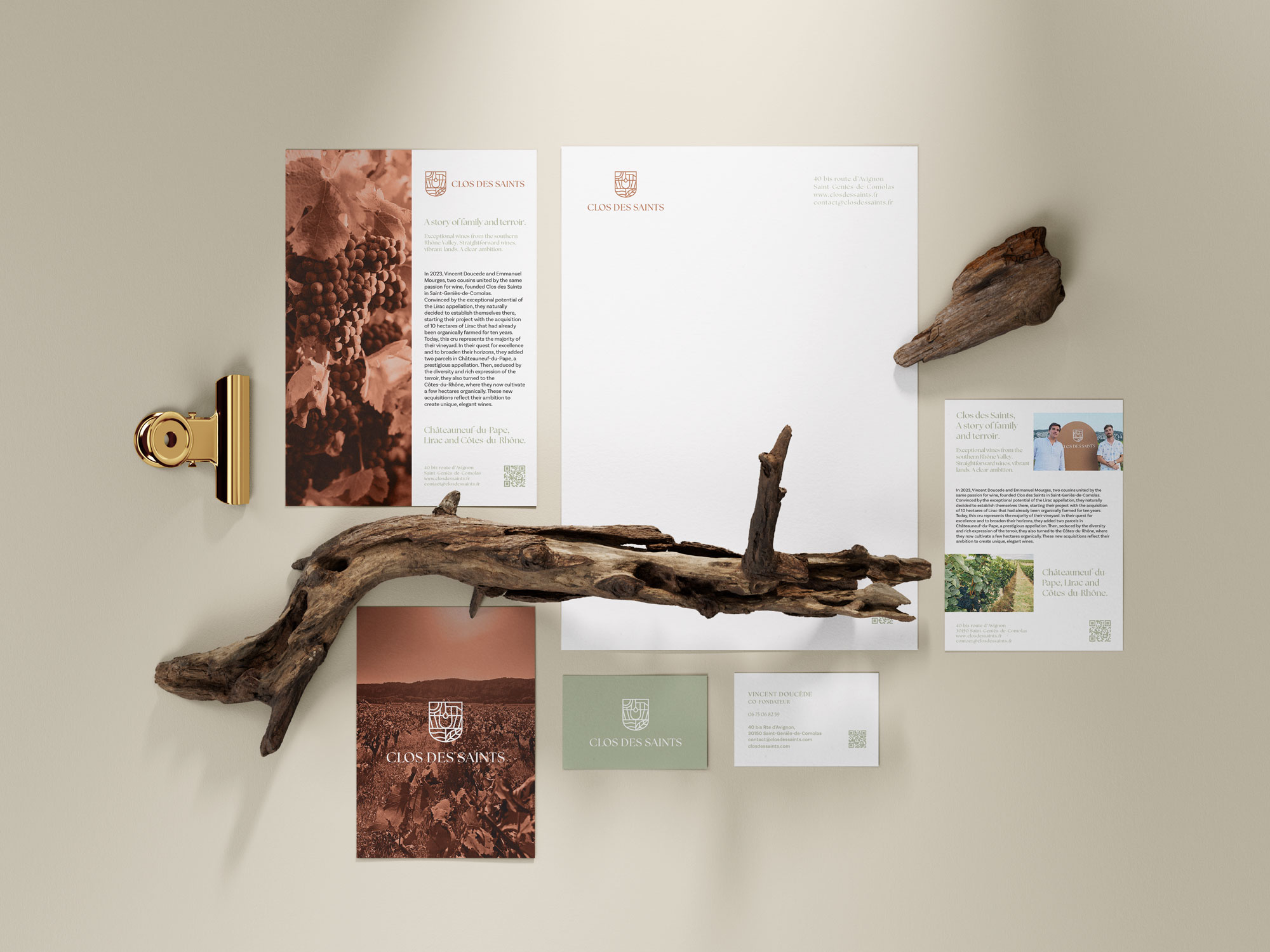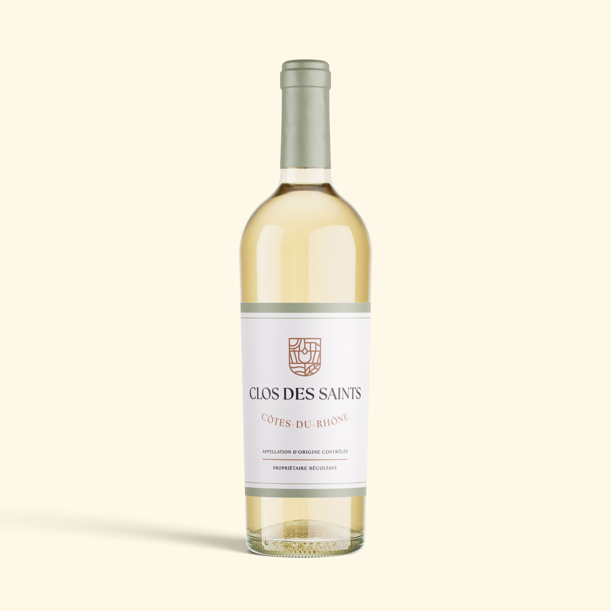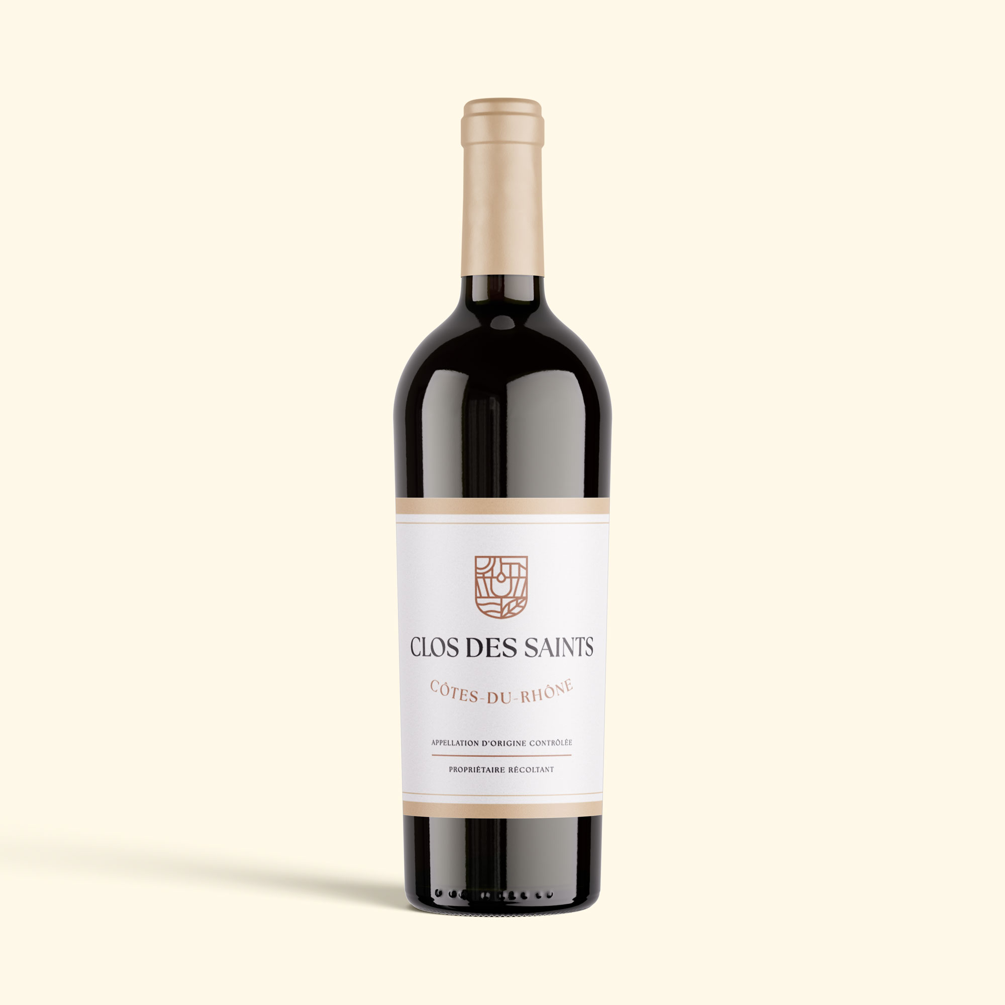 The label design was a central moment in shaping the identity of Clos des Saints. The goal was to step away from conventional wine codes and create a modern, restrained system built around the logo symbol. Acting as both designer and creative partner, I explored more than ten visual directions, experimenting with typography, layout, color and imagery—from graphic interpretations of the mark to photographic references to the estate.